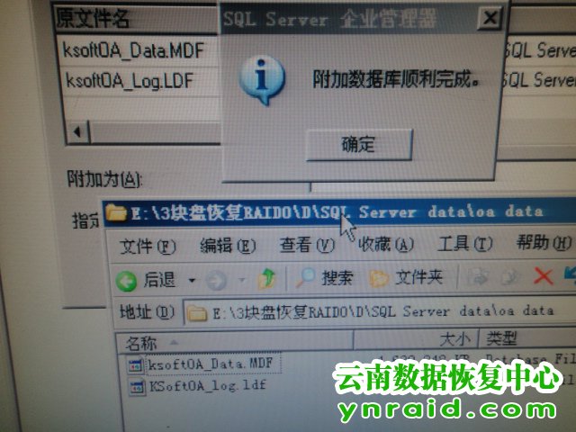 | 数据恢复过程 | 客户告诉我们是RAID5,硬盘还没有带现场检测工程师也以为是RAID5,两块盘报错,两块故障盘检测没有发现任何问题,阵列失效引起,通过分析是3块盘RAID0,块大小 128SEC,通过虚拟RAID平台技术重组数据全部恢复成功,SQL MDF数据库可以正常附加,请看下图: |