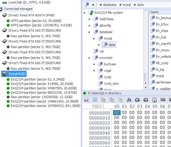 客户之前告诉我是做的RAID5 只是系统启动不了,最后我分析发现做的是RAID10,使用的是LINUX系统 EXT3格式,RAID10 存储原理看图就知道为什么服务器会瘫痪 请看最下方图: 最后通过WINHEX分析快速判断出正确的RAID参数(顺序块大小同步方向),虚拟RAID数据全部展现在我的眼前,服务器挂着好几个网站由于最后掉线的盘坏道太多导致有的MYSQL数据库一部分出现问题,关键网站的MYSQL数据库没有受到影响。由于没有时间研究MYSQL 更多的考虑到MYSQL修复需求量非常的小,更多的尽力都做MS SQL数据库修复。我们后期有时间打算研究MYSQL的修复技术哪怕市场需求在小。 |